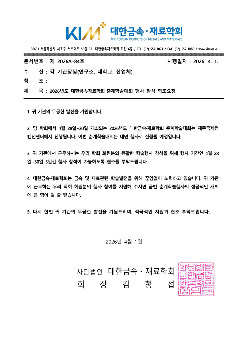 제목 2026년도 대한금속재료학회 춘계학회 행사 참석 협조요청공문[다운받기]