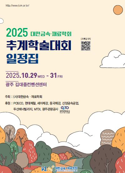 대한금속·재료학회 추계학술대회 일정집을 안내 드리오니, 회원 여러분의 많은 관심과 참여를 부탁 드립니다. «2025년도 추계학술대회 » - 일자 : 2025. 10. 29.(수) ~ 10. 31.(금) - 장소: 광주 김대중컨벤션 센터 ► 2025년도 일정집 다운로드 클릭 ▶ 추계학회 참가 등록 신청 바로가기(Click) ※ 공지된 내용은 학회 사정에 따라 변경될 수 있으므로, 추후 공지될 일정집 최종본을 반드시 확인해 주시기 바랍니다. ※ 오타 및 오기입만 수정 가능하오니, 수정 사항은 10월 15일(수) 자정까지 kimhak@kim.or.kr 로 보내 주시기 바랍니다. ※ 저자 표기 순서가 시스템 오류로 인해 입력 순서와 다르게 기관별로 표기된 부분이 확인 되었습니다. 현재 저자 입력 순서대로 수정 작업을 진행 중이며, 정정된 일정집은 추후 재공지 될 예정이오니 양해 부탁드립니다. |